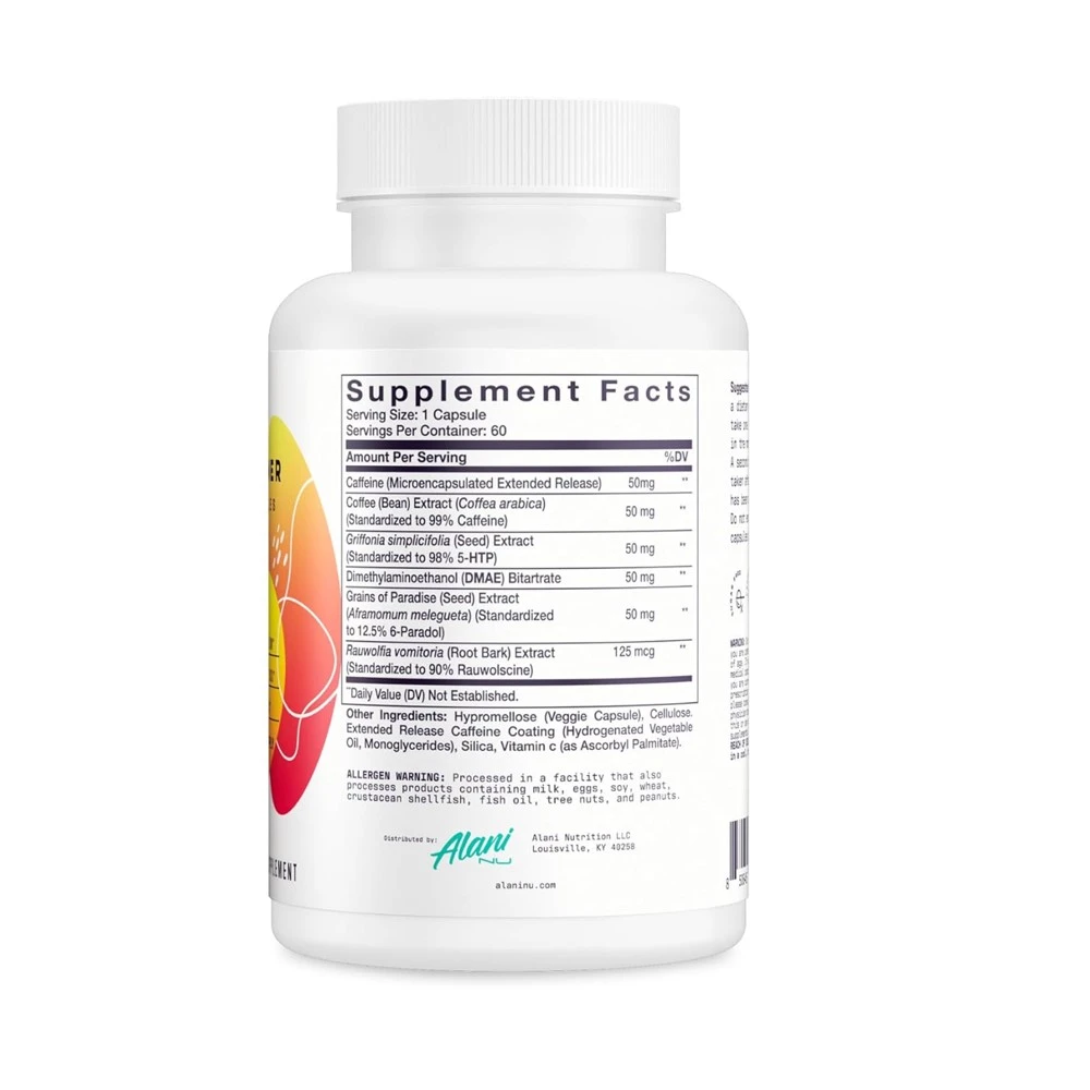 The formula typically includes a blend of thermogenic and metabolic support ingredients such as caffeine, green coffee bean extract, green tea extract, Griffonia simplicifolia (5-HTP), DMAE, and other plant extracts and supportive compounds. Capsules also contain standard excipients and vegetable capsule shells. Ingredients may vary depending on the product version or batch.
