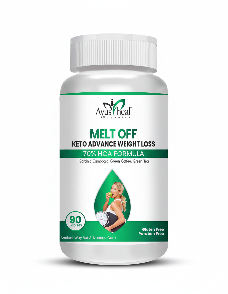 Ayus Heal MELT OFF Keto Advance is a dietary supplement designed to support weight loss and fat burning, especially for those following a keto lifestyle. The formula contains Garcinia Cambogia standardized to 70% Hydroxycitric Acid (HCA) along with green tea extract to help boost metabolism and promote fat reduction. The product is gluten-free and paraben-free.