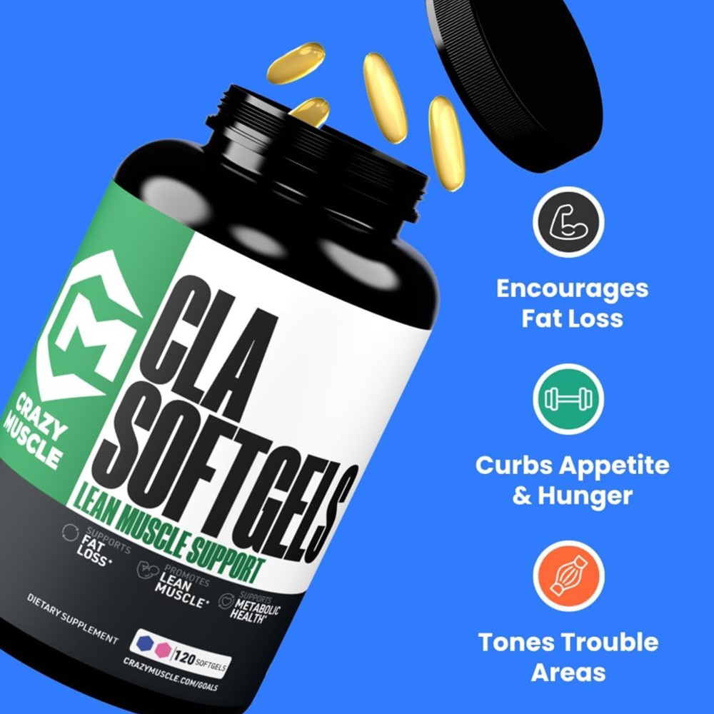 Crazy Muscle CLA Lean Muscle Support Softgels are dietary supplements formulated to support body fat reduction, lean muscle maintenance, and overall body composition. The formula uses conjugated linoleic acid (CLA), a naturally occurring fatty acid, to help support weight management and fitness goals when combined with diet and exercise.