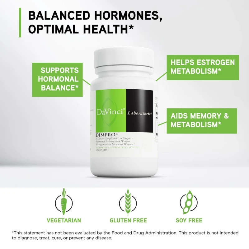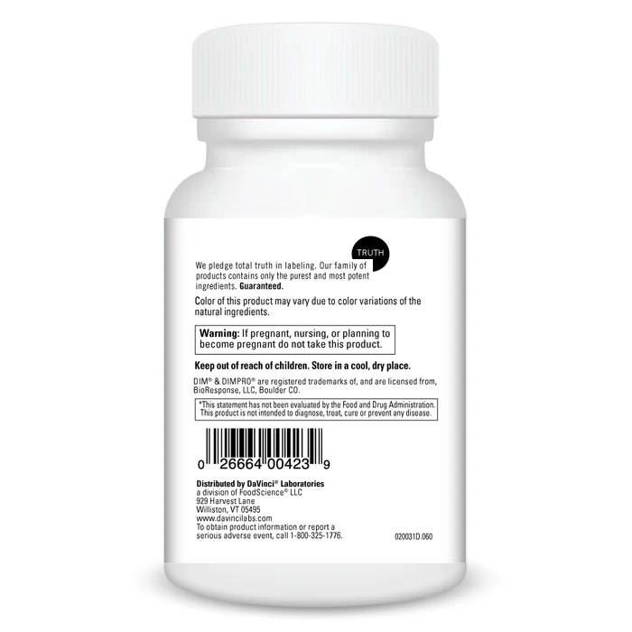 DAVINCI Labs DimPro Capsules are dietary supplements made to support hormone balance, metabolism, and overall wellness. They contain DIM (Diindolylmethane), a natural compound found in cruciferous vegetables. DIM helps support healthy estrogen metabolism and proper hormone function when used with a balanced diet and healthy lifestyle.
