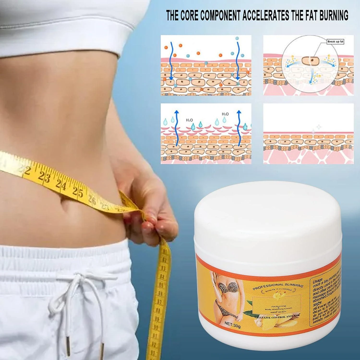 Ginger Fat Burning Cream is a topical product applied to the skin. It is made to support fat reduction in specific areas and improve skin appearance. It works by boosting circulation and creating a warming (thermogenic) effect when used with a healthy diet and regular exercise.