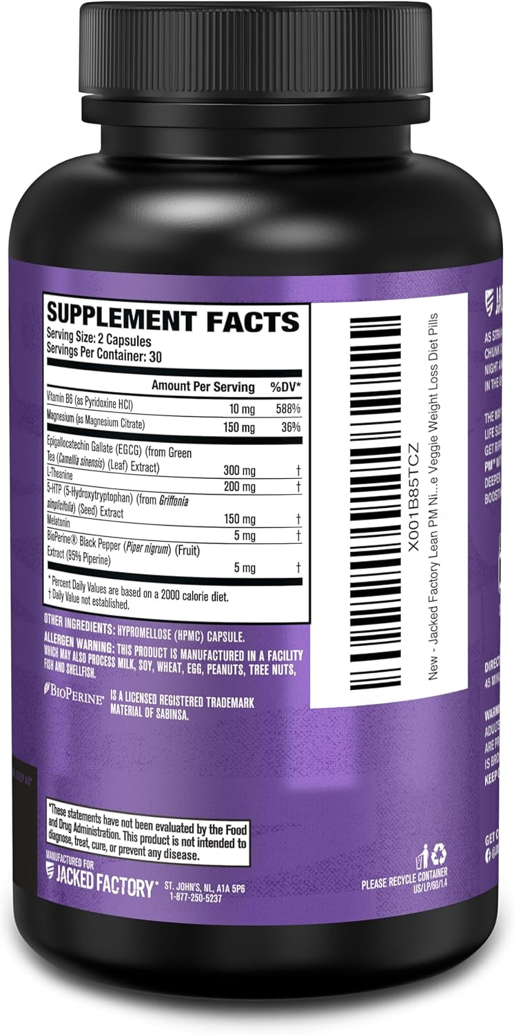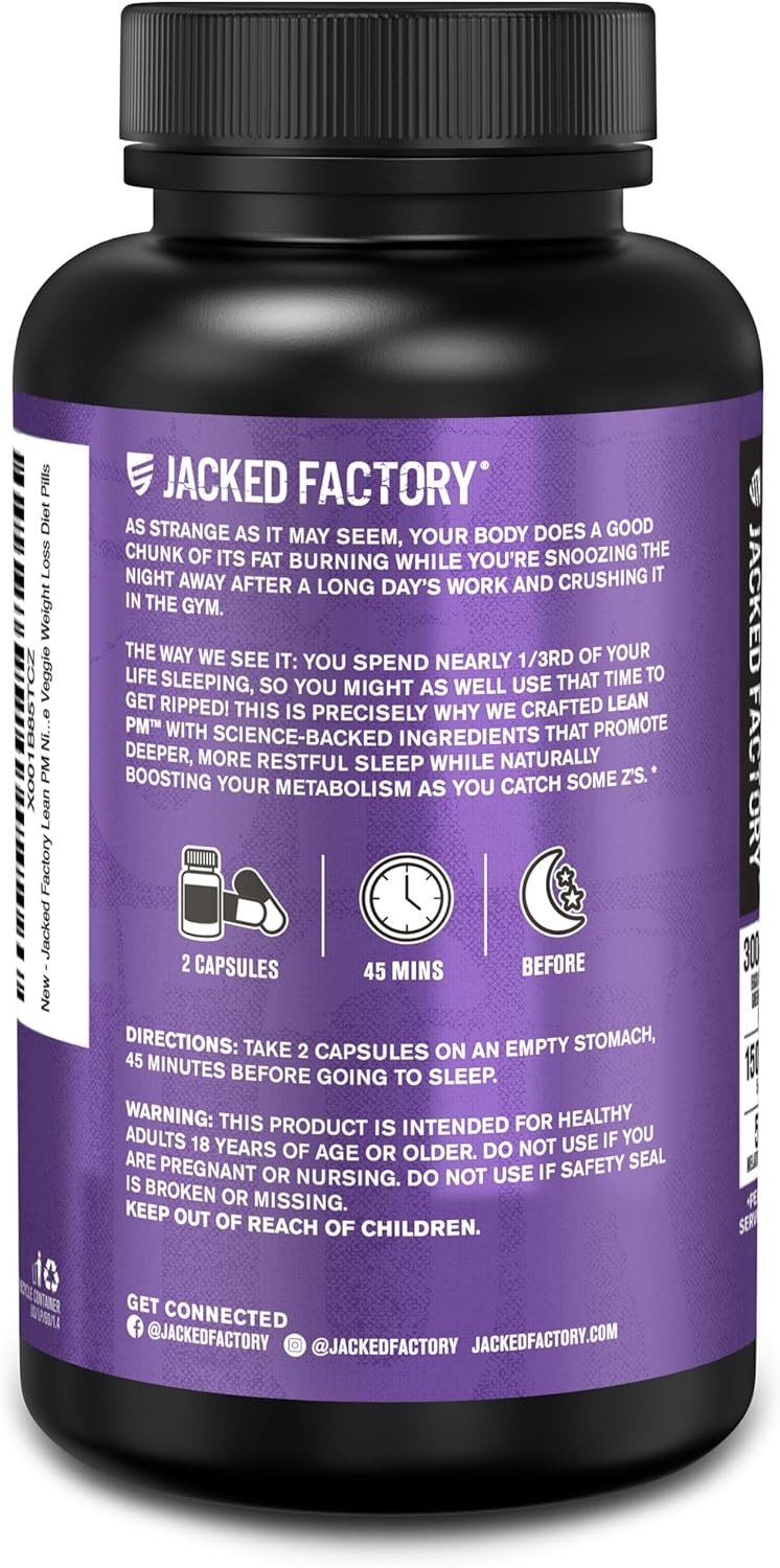 Jacked Factory Lean PM Capsules are a dietary supplement designed to support overnight fat burning and weight management. The formula is created to work during rest by supporting metabolism, recovery, and appetite control while promoting relaxation and quality sleep as part of a healthy lifestyle.