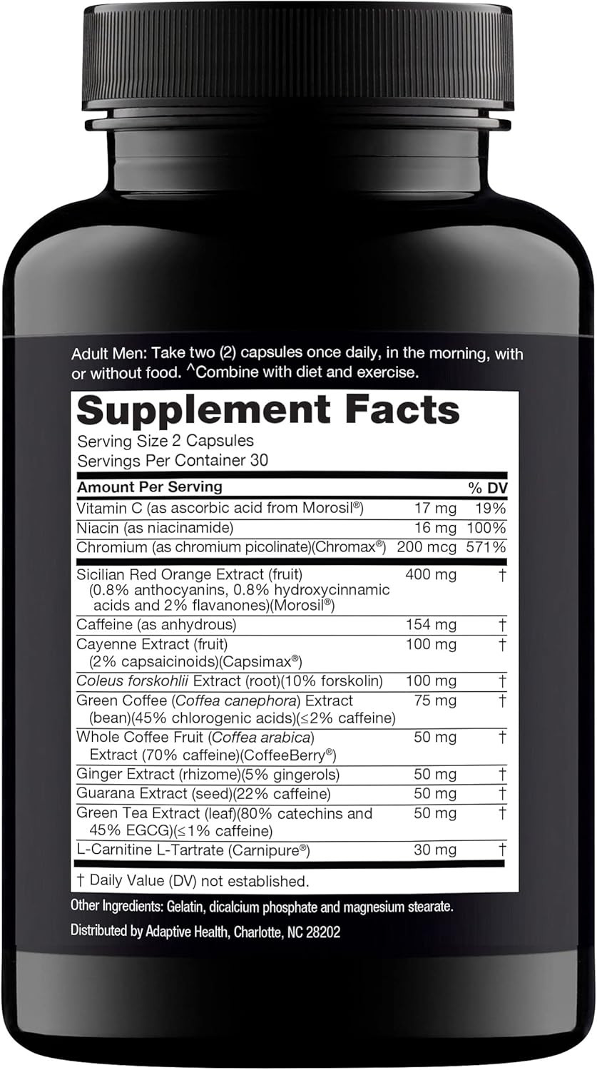 This formula commonly includes Caffeine Anhydrous, Green Tea Extract, Capsimax Cayenne Pepper Extract, L-Carnitine, Chromium, and Black Pepper Extract. It also contains supportive vitamins and standard capsule ingredients such as a vegetable capsule shell and excipients. Ingredient composition may vary slightly depending on formulation or batch.